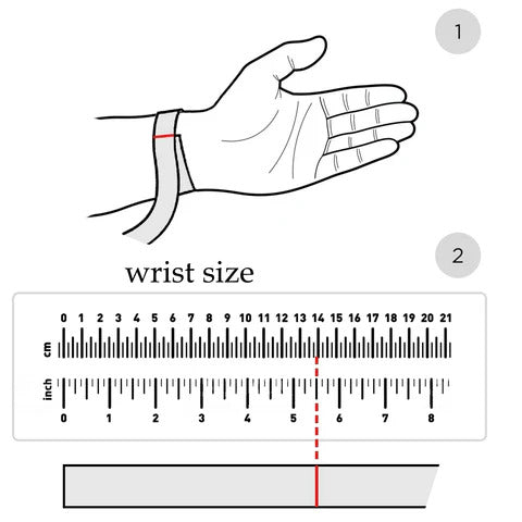 Using a flexible measuring tape with your palm open and facing up, wrap the measuring tape around your wrist, just above your wrist bone. Note down measurement of your wrist size.
